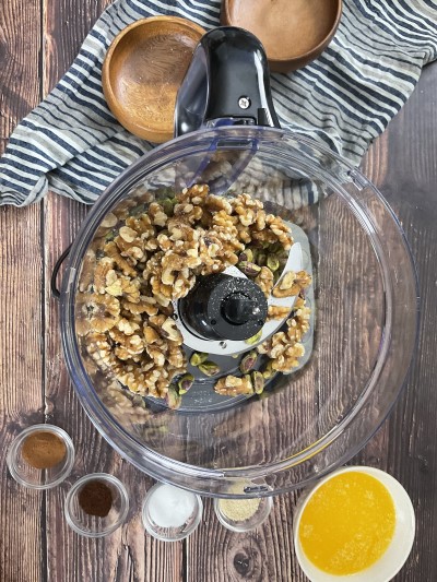 - Για τη γέμιση, βάλτε σε ένα πολυκόφτη τα καρύδια και τα φυστίκια και κόψτε τα έτσι ώστε να μην έχετε μεγάλα σκληρά κομμάτια.
